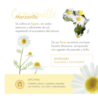 Extracto de Manzanilla (Matricaria recutita L.): aclara de manera natural gracias a su contenido en apigenina, un pigmento vegetal amarillo.