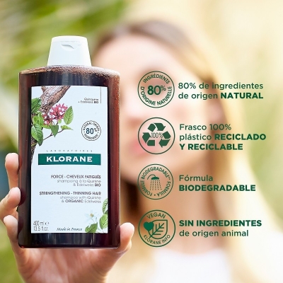 Klorane Champú al Extracto de Quina 400ml: fortalece y revitaliza el cabello debilitado. Su fórmula suave protege el cuero cabelludo y previene la caída. Uso frecuente para un cabello más fuerte, denso y saludable.
