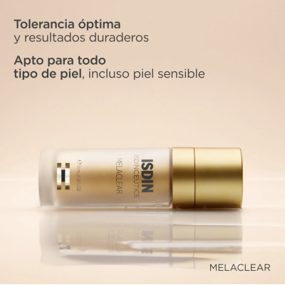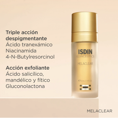 Isdinceutics Melaclear Serum Antimanchas 30 ml: Sérum despigmentante que ayuda a reducir y prevenir todo tipo de manchas, unificando el tono de la piel y aportando luminosidad. Formulado con ácido tranexámico, niacinamida y Spot Corrector Complex, es apto para todo tipo de pieles, incluso las sensibles.
