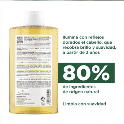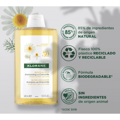 El Klorane Champú a la Camomila está formulado para realzar y aclarar progresivamente los reflejos dorados del cabello rubio natural o con mechas. Gracias a su extracto de camomila (Matricaria recutita L.), conocido por sus propiedades iluminadoras, limpia suavemente el cabello mientras potencia su brillo y luminosidad, aportando un tono dorado natural. Ideal para cabellos rubios, claros o con mechas, así como para mantener el cabello brillante y vital durante todo el año.
