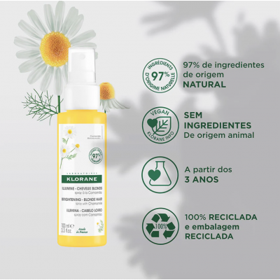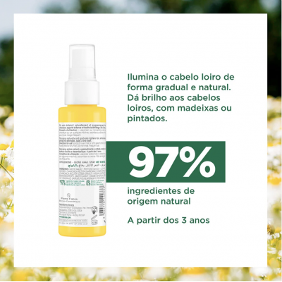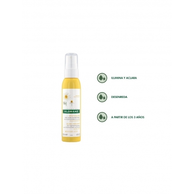 Klorane Spray Camomila Cuidado Solar Aclarante 100 ml: Spray aclarante 3-en-1 que ilumina progresivamente los reflejos rubios o castaños claros, aporta brillo natural y desenreda sin necesidad de aclarar. Ideal para cabellos rubios naturales o con mechas; puede usarse desde los 3 años con eficacia visible tras varias aplicaciones.