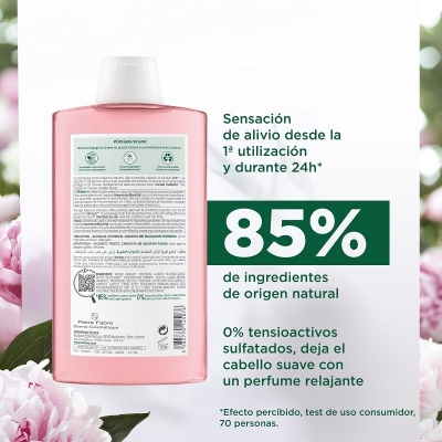Klorane Champú Peonía Picor Cuero Cabelludo 400ml calma y alivia el picor desde la primera aplicación. Su fórmula con extracto de peonía protege el cuero cabelludo sensible y suaviza el cabello. Uso frecuente para un cuero cabelludo equilibrado y un cabello suave, ligero y saludable.