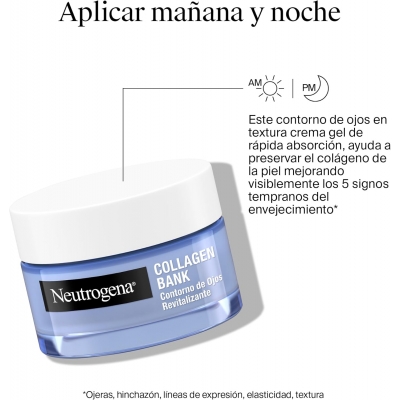 Neutrogena Collagen Bank Contorno de Ojos Revitalizante 15g revitaliza la mirada y mejora la firmeza de la zona del contorno. Su fórmula con Pro-Retinol y péptidos estimula la producción de colágeno y suaviza líneas finas. Uso diario para un contorno más liso, luminoso y visiblemente rejuvenecido.