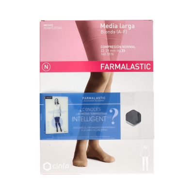 Cuidar de tus extremidades es importante, especialmente si sufres patologías venosas como: varices tronculares, trombosis venosa o síndrome postrombótico. Para mimar esas piernas que tanto necesitamos mantener en óptimo estado de salud, Farmalastic ha creado Farmalastic media larga blonda (A-F) compresión normal. Indicado especialmente para personas en tratamiento de patologías venosas y embarazadas con tendencia al edema. Farmalastic media larga blonda (A-F) compresión normal no deja marca de la goma en la pantorrilla y la puntera no comprime los dedos. Se sujeta con una blonda de silicona que son mucho más elegantes que las medias cortas. *Este producto solo incluye una única media. La T-reina plus tiene aproximadamente un contorno de pantorrilla de 43-45 cm y de tobillo 28-29 cm. **Por motivos de higiene, no se aceptarán cambios ni devoluciones de este producto. ¡Devuelve a tus piernas la circulación que necesitan!