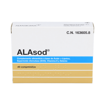 Alasod 20comp es un complemento alimenticio antioxidante que refuerza nuestro sistema celular y combate su oxidación.Gracias a su formulación con ácido ?-lipoico, superóxido dismutasa y vitamina E actúa frente al estrés oxidativo causado por los radicales libres, uno de los factores más perniciosos para nuestra salud.Ayuda a prevenir la oxidación de tu organismo.