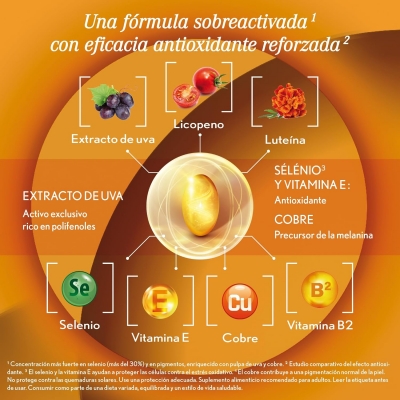 Este complemento alimenticio no sustituye el uso de un protector solar tópico. Es indispensable utilizar una protección solar adecuada para su tipo de piel. No superar la dosis diaria recomendada. Mantener fuera del alcance de los niños. Las personas bajo supervisión médica, mujeres embarazadas o en período de lactancia deben consultar a su médico antes de tomar este complemento alimenticio. Conservar en un lugar fresco y seco, protegido de la luz solar.